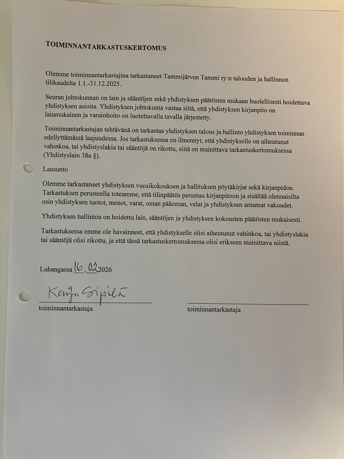 Tammijärven Tammi ry on 10.2.2026 jättänyt kohdeavustushakemuksen 21.2.2026 järjestettyyn Laturetkeen, joka on osallistujille maksuton vapaaehtoisvoimin toteutettava tapahtuma.